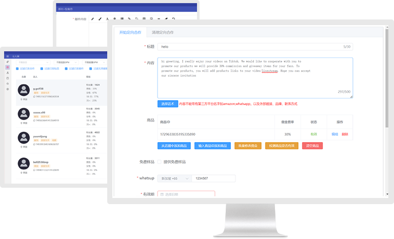 桥红软件可以自动向店铺后台达人广场筛选出的优秀创作者发送批量邀约,邀请他们与品牌或用户进行合作。这些邀约可以包括定向计划/在线沟通(私信)发送合作话术,产品图片,商品卡等信息,将使您的合作过程更加简单、高效。