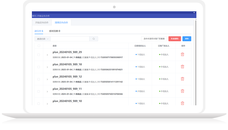 桥红软件可以根据用户需求在已进行的定向计划里批量删除无意向合作创作者,并可在已进行的定向计划里批量发起定向邀约或在线沟通(私信)。更充分利用定向计划合作名额和节省您宝贵的时间,并提高合作效率。