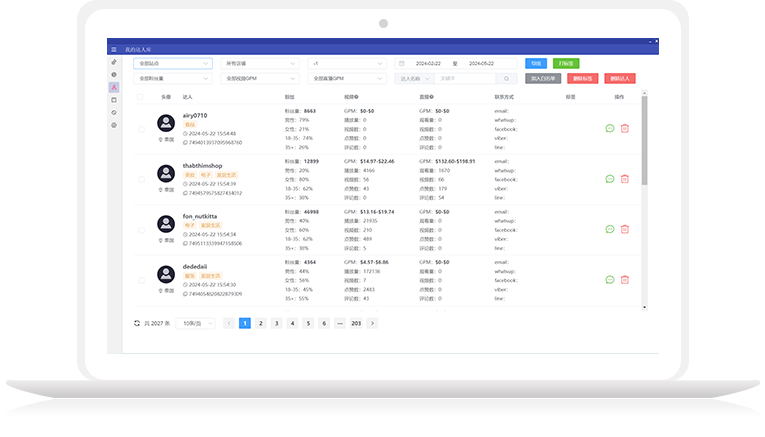 桥红软件可以根据用户指定的条件和标准,在精准达人圈上自动筛选符合要求的优秀创作者进行建联合作。这些条件可以包括GPM、粉丝数量、粉丝类别、播放量、视频数等,您可以根据产品的目标受众和带货能力来筛选出最合适的达人。